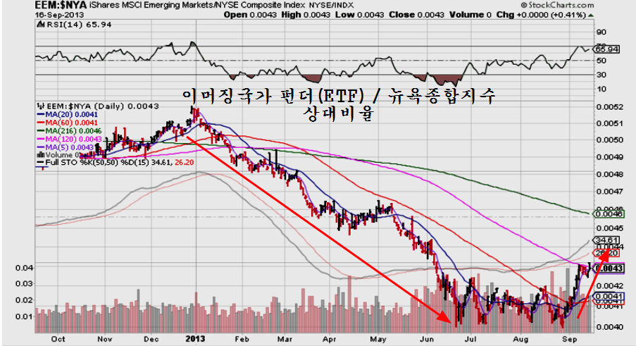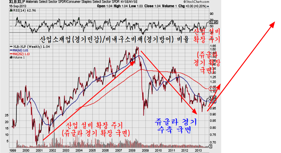 하반기 들어 나타난 가장 중요한 특징이, 바로 이머징국가의 주가지수가 선진국 증시의 주가지수보다 더 강하게 움직이는 이머징 국가 선도 국면과, 경기 민감주가 경기 방어주보다 강하게 움직이는 경기주 선도 국면이라는 점이다. 이 두 가지 모두 경기 회복국면에 나타나는 특징으로 쥬글라 경기 주기를 감안하면 2013년 하반기 이후 2017년까지 이런 국면은 추세적으로 이어지기 쉽다.