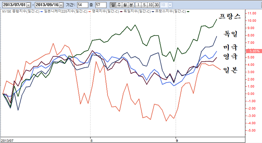 뿐만 아니라 상반기 말 차익 실현했던 선진국 증시 역시 상승이 이어져 세계 자산시장은 특히 주식 시장으로 자금 유입이 늘고 있다. 세계 주요국 제조업 PMI의 경기 확장국면 진입, 주요국 경기 선행지수의 상승세가 확연해지면서 채권보다는 주식과 상품 시장으로의 자금 유입이 활발해지고 있다.