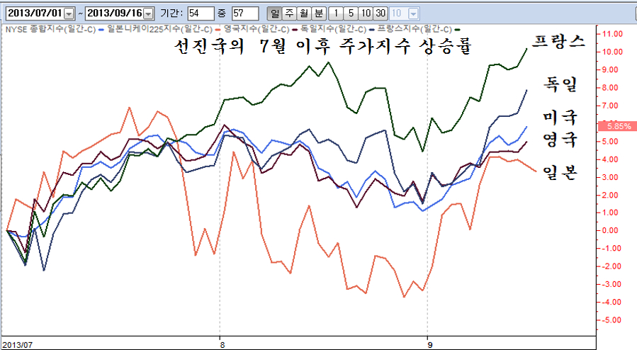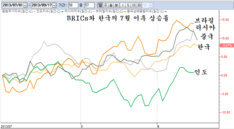 이런 주식 매수는 한국에 국한하지 않는다. 7월 1일 이후 각국 주가지수의 변화를 보면 브라질 14%, 러시아 12%, 중국 10%, 한국 8%, 인도 1%등 이머징 국가가 특히 많이 올랐다.
