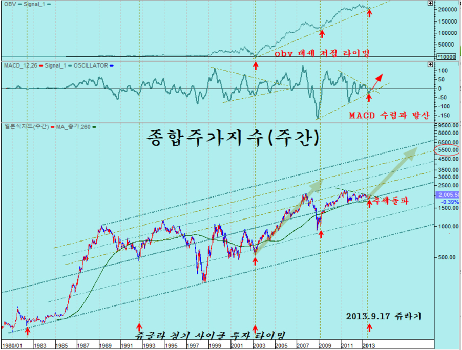 이런 대세의 저점의 모습과 저점에서의 상승 출발은 주봉 거래량 지표인 obv의 추세 분석이나 주가 이격도인 MACD 분석에서도 확연히 나타난다. 분산과 매집을 나타내는 것으로 알려진 obv 지표는 2003년, 2008년에 이어 2013년에 대세 바닥을 형성한 후 상승 추세로 전환이 진행 중이고, MACD는 2011년 이후 수렴 조정을 거쳐서 확연한 상승으로 움직이고 있다. 한번 상승하면 추세가 적어도 3년 이상 이어지는 대세 상승이 시작된 것이다.