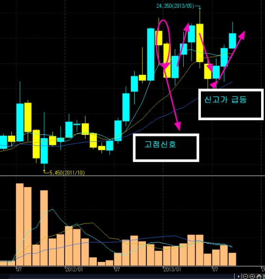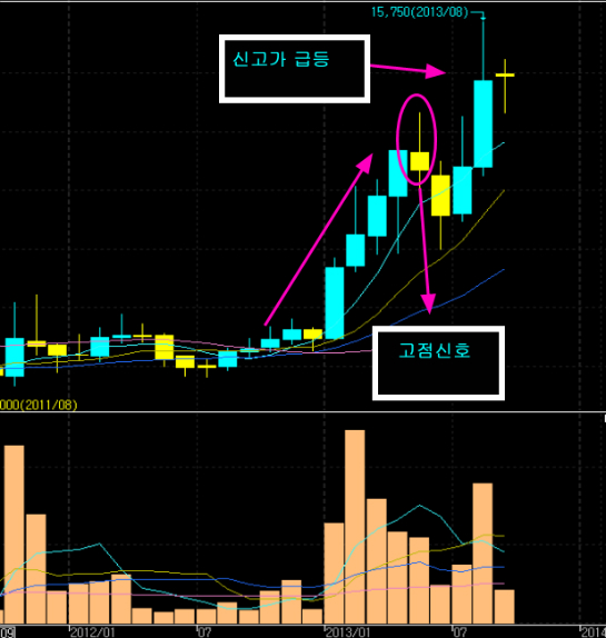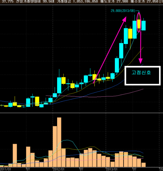위챠트는 휴온스의 월봉 챠트 흐름이다. 장기상승하면서 3개월전 고점신호가 나타났음에도