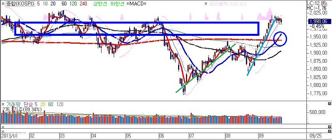 이후 하락에 대한 반등국면이 나타났으나 이번엔 b.b상단밴드에 근접도 못한 상황에서 조정이 시작되고 있는 형국으로 많이 약한 모습을 보여주는데 이는 부채한도에 대한 우려와 출구전략연기로인한 경기에 대한 의구심이 작용하고 있다 보여진다