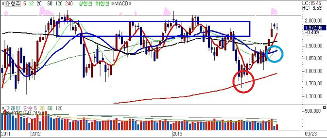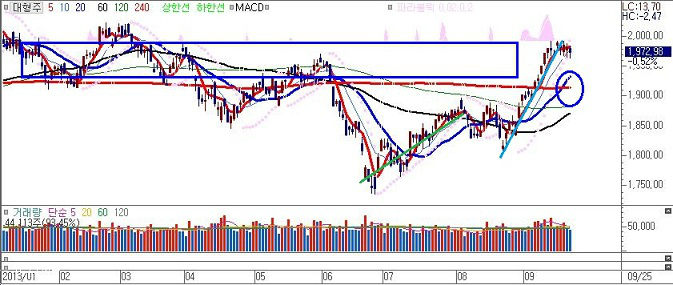 또한 주봉차트마저 빨간원을 잘살펴보면 상단에서 20주선과 60주선의 이격이 조금 좁아진것을 볼수 있는데 이는 이제 이격조정이 마무리 단계에 이른것으로 생각된다