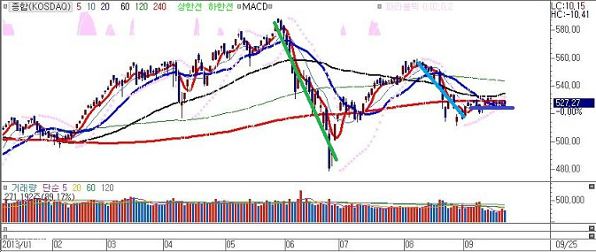 코스닥의 경우 여기서 더 저점을 내주는 하방배팅이 나오면 추가상승이 힘들만치 차트형태가 훼손될것으로 보이는데 이는 역설적으로 상승의 기운이 강화되고 있다 생각된다