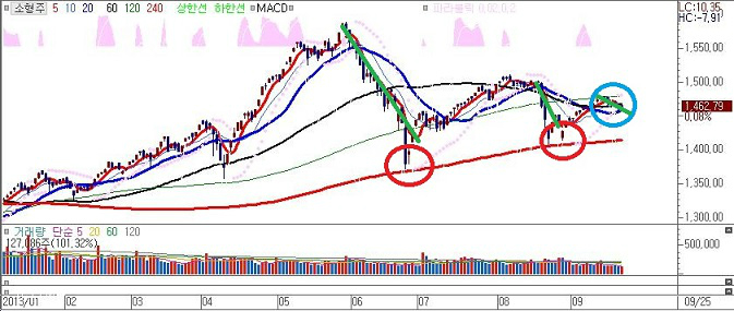 소형주를 살펴보면 이제 횡보조정의 마무리 단계로 들어가고있는 형태라 보여지는데 이는 녹색선을 살펴보면 07월의 큰 하락장대에서 09월 작은 하락추세에 급기야는 횡보국면에 이르고 있다.