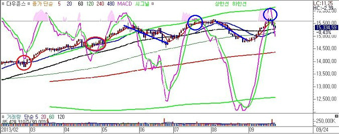 작년부터 이어오던 b.b상단밴드를 지지선으로 삼고 올라오던 다우지수가 06월경 무너진이후 07월경 재반등, 그러나 한번 무너진 상단밴드에 도달하니 그동안 지지선으로 작용하던 b.b상단밴드가 저항선으로 발동되었다.