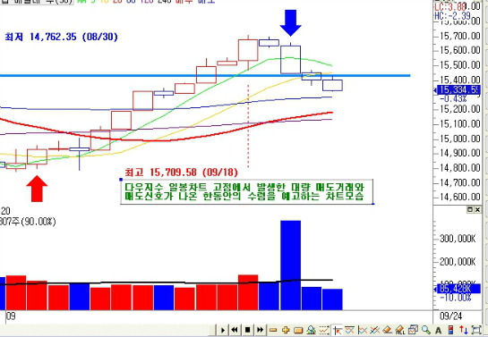 추석이후까지 지속적으로 이루어진 지금 다우지수가 역사적 신고가를 기록한 이후 대량거래를 수반한 장대음봉과 함께 출현한 매도신호가 우리시장도 연동 한다면 대형주의 숨가쁜 랠리를 만든 외인들 수급도 주춤 할 수 밖에 없을 것이고