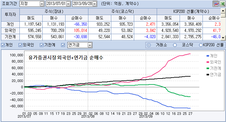 유가증권시장에서 외국인과 연기금이 순매수를 주도하고 있는 가운데 개인과 연기금 이외는 기관은 순매도 기조를 지속하고 있다. 다만 외국인들이 매수규모가 2010포인트 전후에서 감소하는 가운데 선물시장과 연계한 프로그램 매수가 급증하고 있어 파생시장과 연계한 플레이가 보이므로 이후 시장에서 외국인 들의 선물시장에 대한 포지션의 변화를 눈여겨 볼 필요가 있겠다.