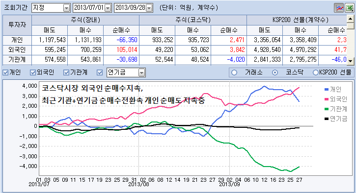 코스닥시장에서 외국인이 순매수를 주도하는 가운데 개인이 8월이후 순매수에 가담했다. 하지만 9월중순이후 개인들은 매도세를 보인후 최근 매도 규모가 늘어나고 있은 가운데 외국인과 연기금 기관은 최근 순매수로 전환하면서 수급 개선의 모습들이 나타나고 있다.