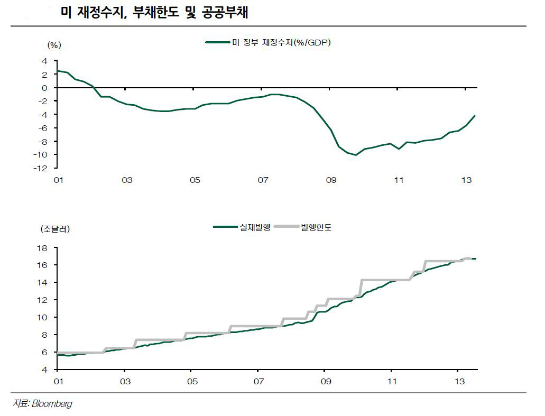 따라서 이번에도 합의에 실패해 연방정부 폐쇄라는 최악의 상황이 나타나더라도 그 상황의 지속성은 길지 않을 것으로 판단된다. 미국 경기가 오랜만에 회복 기미를 보이는 과정에서 국민적 비난은 강할 것이기 때문에 정치적 부담이 비례해 클 수 밖에 없고 이는 짧은 기간내 여야 합의를 이끌어낼 수 있는 여건으로 판단하는 것이다. 과거의 학습 효과를 떠나 머지않아 양적완화 축소가 예정된 상황에서의 재정이슈 부각이 양당 모두에 부정적이란 측면도 한 몫 할 수 있고 미 정부의 재정수지가 개선되고 있어 부채한도 증액에 대한 갈등이 연초보다는 적을 수 있다.