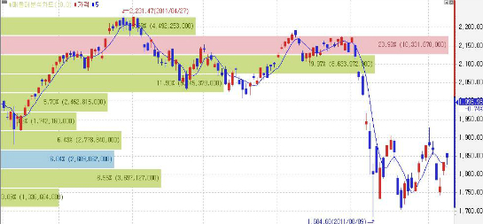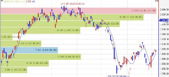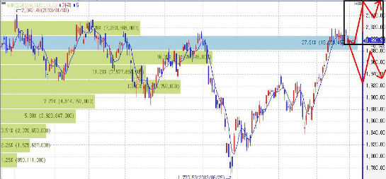 2,030포인트까지 형성된 최대 매물벽을 놓고 현재 지수는 과열 해소 공방을 벌이고 있다. 시장의 기조적 상승을 보려면 이상의 매물대를 돌파해놓고 이를 지지로 돌리는 조정이 나타나야 강한 시장을 기대할 수 있다. 그렇지 않고 이 매물벽을 저항으로 일각에서 말하는 조정 폭이 나타날 경우 2011년, 2012년도와 마찬가지로 강한 시장의 상승을 기대하기 어려워진다.