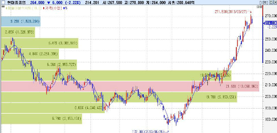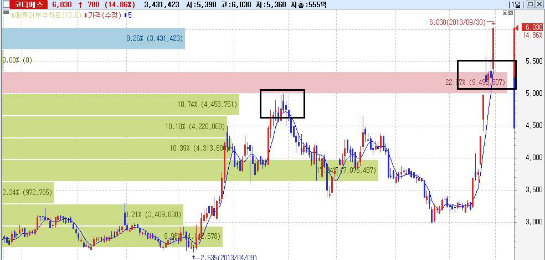 이는 주가도 마찬가지다. 오늘 상한가를 기록한 코디에스(080530)의 경우 최대 매물벽까지의 강한 상승이 나타났고 여기에서 단기 매물을 지난주 소화했다. 여기서 코디에스의 주가가 매물벽 아래로 더 빠졌다면 강한 되반등이 어려웠을 것이다. 그러나 코디에스의 경우 이 매물벽을 지지로 삼았고 오늘 상한가라는 강한 되반등이 가능했다.