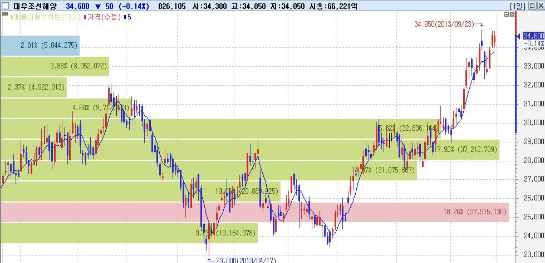 여기에 지수 조정시 어떤 종목을 저가매수할지의 해답이 들어있다. 현재의 거래소는 IT대형주가 주도주가 아니다. 여전히 소재/산업재다. 이중에서도 대표적 주도섹타인 조선주를 보면 강력 매물대를 벗어나 있음을 알 수 있다. 이런 섹타가 지수 조정시 저가매수를 노릴 타켓이다.