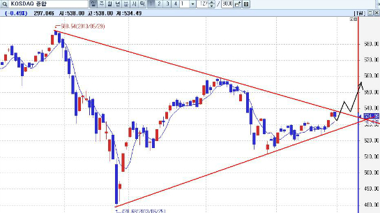 지난주 초 무료 공개방송을 통해 코스닥의 방향성 조건을 언급했다. 지수상으로는 517포인트 지지기반하에 540포인트 돌파 안착이 나타나야 기조적인 회복 성격임을 말했고 수급상으로는 기관의 재매수(2거래일 이상 100억원 이상의 기관 순매수)가 필요하다고 했다. 지난주 목/금요일 기관은 각 200억원 이상의 순매수를 나타냈고 침체횡보하던 코스닥 지수는 반등했다. 아직은 540포인트 아래기 때문에 이에 대한 추가 확인이 이번주 필요하다.
