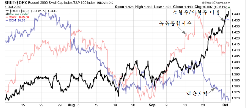 뉴욕종합주가지수는 주로 엑슨모빌 등 시가총액 상위 종목의 하락에 기인하여 하락을 해 왔지만, 시장 본래의 상황을 반영하는 소형주/대형주 상대비율은 대단히 가파른 상승을 하고 있다. 즉, 시장은 지수를 통해 하락하는 척 겉모습을 하고 있지만 이것은 주로 시가총액 상위 대형주에 의해 그렇게 보일 뿐 시장 전반은 활발한 상승을 하고 있다는 의미이다.