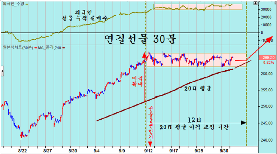 주가가 하락하지 않고 이격을 좁히는 경우 대개 12일 ~ 14일 정체 기간이 거린다. 따라서 9월 만기일 이격 확대 이후 지수가 11일째 조정을 거치고 있는 현재 일반적인 흐름으로 보면 이번주까지로 정체 조정 기간이 마무리 된다.