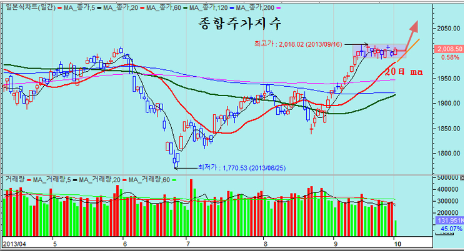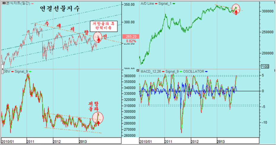 추세는 2011년 ~ 2012년 고점을 잇는 추세가 돌파된 이후 이 돌파된 추세선이 지지가 되고 있다. 따라서 추세 돌파후 힘을 비축하며 새로운 추세를 준비하는 과정으로 3주 가까운 힘의 비축을 거쳐 강한 상승으로 움직이게 된다.