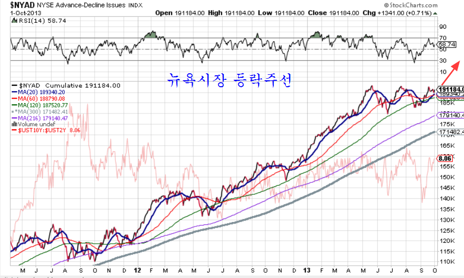 실제 시장의 상승종목수와 하락종목수를 나타내는 등락주선은 큰 조정의 모습 없이 정체 한 후 다시 상승을 준비하는 모습이다. 이 때문에 미국 시장은 뉴스를 통해 나타나는 기만선전에 속지만 않는다면 매우 견실한 상승 추세가 진행중으로 지금은 조정을 거쳐 탄력적인 상승이 준비되는 시점이라는 것을 알 수 있다.
