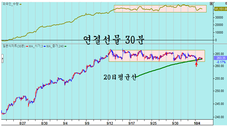 지수의 움직임을 관리하는 외국인은 9월 선물 만기까지 상승에서 이익을 얻는 파생상품 포지션을 구축한 뒤 최대한 가격을 올려 수익을 냈고, 만기가 지나면서 지수의 박스권 전략과 함께 주식을 저가 매수하는 전략을 유지해왔다. 이것은 추석 연휴와 개천절 등 10월 옵션 만기까지 휴일이 많아 지수를 정체시키는 가운데 옵션의 시간 프리미엄을 얻는 전략이 유리했기 때문이다.