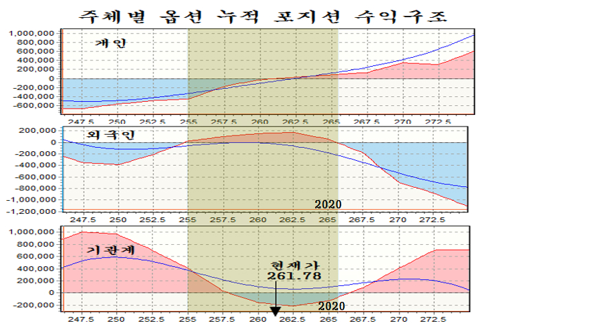 이 때문에 외국인은 옵션 수익구조를 255~265의 10포인트 구간에 가두는 전략을 가져왔고, 그와 함께 주가도 좁은 범위에서 움직임으로써 매도의 이익을 얻었다. 그러나, 다음주 월요일로 옵션 포리미엄이 대부분 사라짐으로써 3일간 거래되는 다음주는 행사가격 265에 해당하는 2020 까지 상승을 기대할 수 있고 이후 본격적인 추세 상승도 기대해 볼 수 있다.
