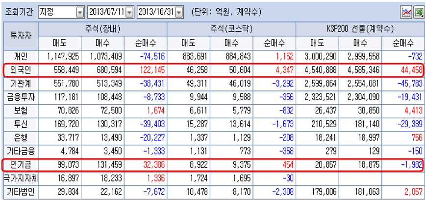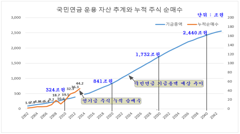 2008년말 주식 누적 순 매수 규모가 10조원에 불과했으나 이후 공격적으로 주식을 사면서 현재 45조원에 이르고 있어서 이기간 35조원 이상의 주식을 순매수하고 있다 이후 여러 어려운 국면이 많았으나 주가가 크게 하락하지 않은 것은 외국인의 매수도 있었지만, 이런 연기금의 매수의 힘도 무시하기 어렵다.