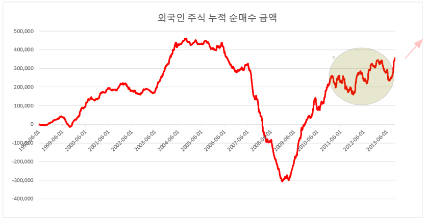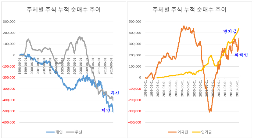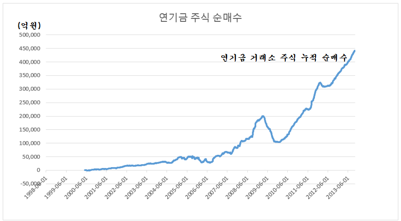 다음은 2000년 이후 국민연금의 주식 누적 순매수 추이이다. 연기금은 2006년까지 주식투자를 기피해오면서 주식 매수가 크지 않았으나, 2009년 이후 주식 비중을 크게 늘리면서 주식 매수가 가파르다.