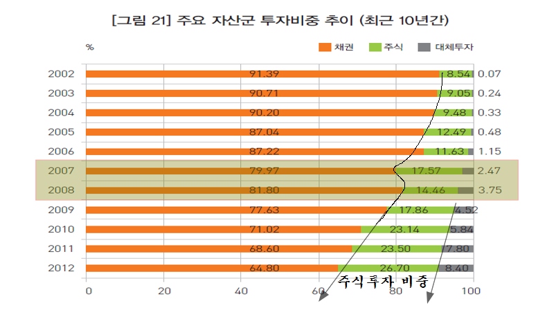 한편으로 기금운용 중 주식투자의 비중도 꾸준히 늘고 있다. 2000년 초 10%대에 불과하던 주식비중은 2012년 국내외 주식을 합쳐 26%로 증가한 후 2014년말에는 30% 이상으로 확대되고 있다. 주식 투자 비중의 2/3은 국내 주식에 투자를 하고 있어서 기금증가와 주식 비중의 확대에 따라 매년 기금의 주식 투자 수요는 가파르게 증가할 수 밖에 없다.