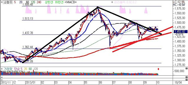 이는 시장에 내재된 매수세의 의지와 힘이 대단하다는것을 의미하며 소형주 지수 1437.78p의 자리가 대단히 중요한 자리입니다.