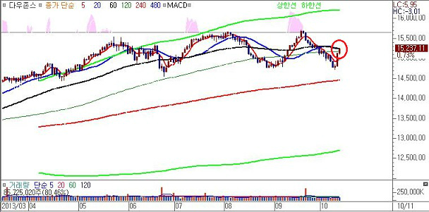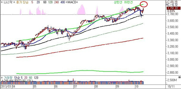 차트상에서도 상단 고점과 하단 60.240일 이평선간 골든크로스를 단지 부채 한도 증액 협상의 건만으로 일시 돌파할수도 있겠지만 결국 시장의 상승은 실적의 힘 혹은 미래의 경기 호황 국면에 대한 희망이 없이는 대세상승 국면으로 나아가기는 어렵다 하겠다