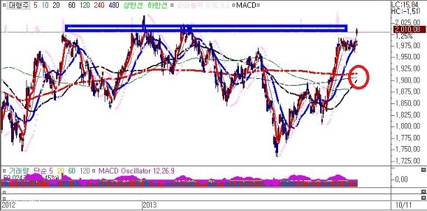 현재 60일 이평선의 값이 1900.576p이며 전일의 경우 1897.729p로서 하루 3p가량 오르고 있으며 240일 이평선의 경우 현재 1915.713p이며 전일의 경우 1915.359p로서 0.3p오르는 상황이라 거의 변동폭은 없다