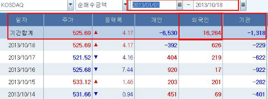 이 같은 수급 동향은 올 전체로 놓고보면 더욱 뚜렷해진다. 올해 들어 외국인의 코스닥 순매수 누적은 1조 6,264억원에 이른다. 반면 기관의 경우 한때 1조 1,000억원까지 기록되었던 순매수 누적이 현재는 1,318억원의 순매도로 바뀌어 있다. 이에 대해 거래소와 달리 코스닥 지수는 부진한 흐름을 나타낸다. 이는 거래소와 달리 코스닥의 경우 기관이 시총 상위 종목 내지 대표 종목들의 물량을 많이 갖고 있었기 때문이다. 이게 바로 거래소와 코스닥의 차이였다.