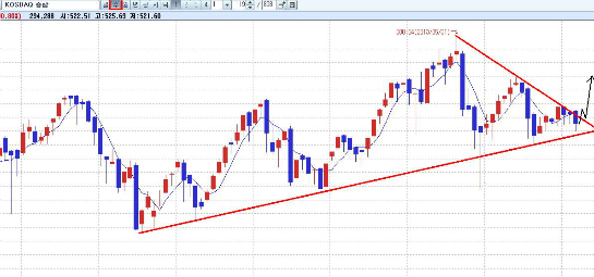 주봉 챠트상의 그림도 이전 전망과 정확하게 일치하고 있다. 위 그림에서 보듯 거래소 지수는 지지와 저항을 정확하게 만들어가며 우상향을 유지하고 있다. 이상의 주봉 챠트 그림은 이미 필자가 오래전 예고해드린 그림이며 이후 흐름이 이 틀에서 정확하게 움직였다.
