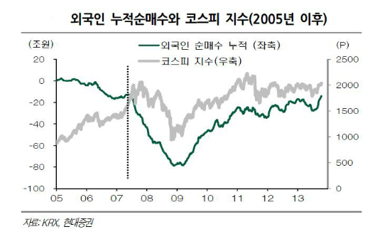 둘째, 거래소 지수의 수급과 연계된 특징이다. 거래소 지수는 기관보다는 외국인의 영향을 많이 받는다. 이는 시총 상위 종목 및 업종 대표주 물량을 외국인이 상당히 장악하고 있기 때문이다.