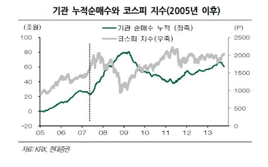 위 그림에서 보듯 최근 6~7년간 거래소 지수는 외국인의 수급에 그대로 비례되고 있음을 알 수 있다. 반면 기관 수급과는 반비례로 움직이고 있음을 알 수 있다. 그렇다면 현재의 거래소 수급 동향은 지수의 추가 상승을 암시하는 것이지 하락을 염려하는 것은 시기상조가 될 것이다.