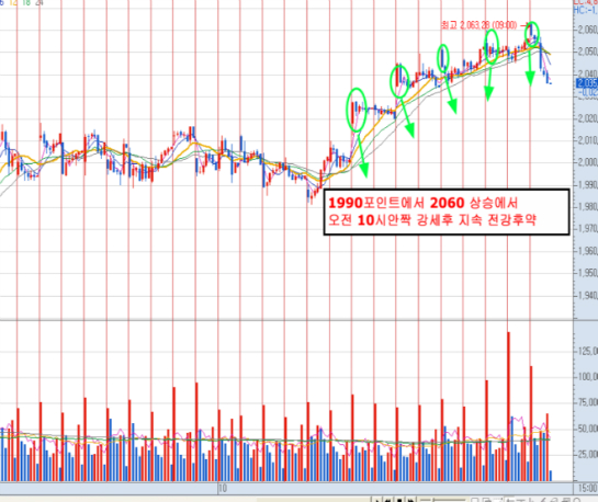 10월 내내 오르는 과정에서 분봉상 아침 시작만 강하지 실제 강세장에 전형인