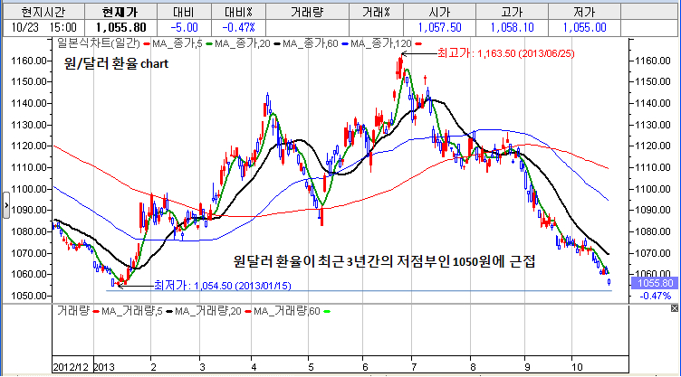 오늘 기준 원달러 환율이 1055원을 기록하면서 최근 3년간 박스권 하단인 1050원선에 바짝 근접하는 모습이다. 최근까지 외국인들의 자금 유입이 지속되면서 원.달러환율이 하락세를 보이고 있지만 1050원선 전후에서 하방경직성을 보일 가능성이 있다. 외국인들의 환율하락에 따른 환차익에 대한 기대심리는 다소 약화될 가능성이 있는 대목이다.