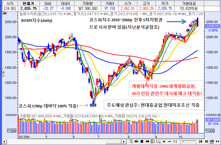 그래서 지난 분석글에서 최근 2년여간의 박스권 상단부인 2050p 전후에서는 지수관련성이 큰 대형주는 시세는 즐기되 매수보다는 차익실현 기회를 엿보아야 한다고 의견 드리는 것이다. 지수관련주는 매도로 대응하고 중소형 실적주와 재료가치 우량주 발굴에 집중하길 바란다.
