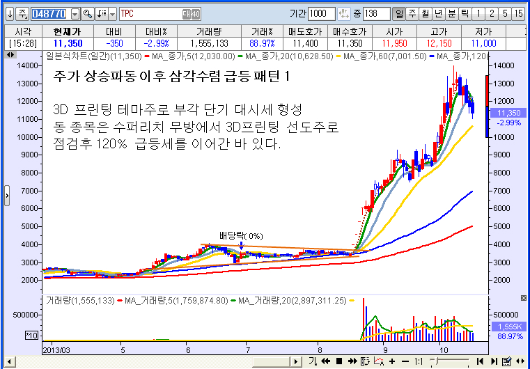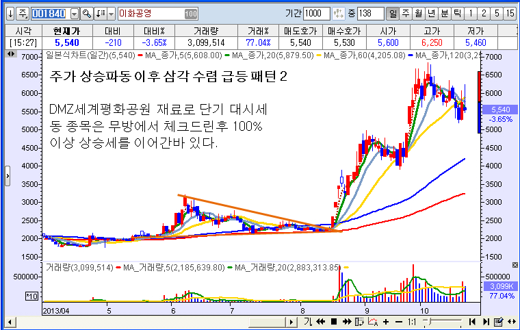1차 상승흐름 이후 삼각수렴 그리고 대파동을 형성한 사례 종목들이다.즉, 매집성 거래 형성 이후 재료가 터지면서 단기 대파동을 형성한 케이스의 종목들이다.