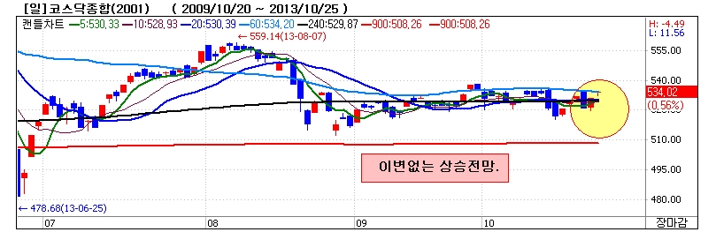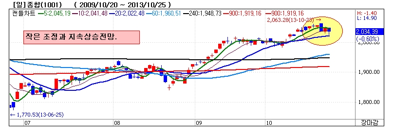 시장에 대한 해석은 장초반 상승했다가 재차 밀렸을지라도 10/23일 이후로 매일매일 지속적으로 저항을 돌파하여 시작했기 때문에 계속 돌파로 해석하는 것이 정답에 가깝다고 보겠다. 이번주후반 약간의 조정을 받는 모습이 나왔고 외인의 매수세가 현저하게 약화되는 모습을 보였기 때문에 일부에서는 하락으로 해석할 수도 있으나 필자는 추세의 지속으로 해석한다.