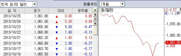 원.달러 환율 하락세가 계속되며 외국인들의 매수가 위축되어졌다 하지만 지난 24일 원.달러 환율 하락세가 계속되며 한때 연저점을 경신하기도 하였으나 외환 당국의 개입으로 수직 상승하는 모습을 보여주며 1060원대를 다시 회복하는 모습을 보여주었다.