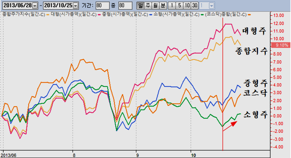 코스닥 및 중소형주의 경우 5월 고점 이후 주가가 5개월여에 걸쳐 장기간 조정이 이어져, 기간이나 가격 면에서 조정이 충분한데다가 시장의 지표상 등락비율이 중기 바닥권에 있어 점차 상승 추세를 회복하는 종목이 많아지는 추세 시작을 나타낸다.