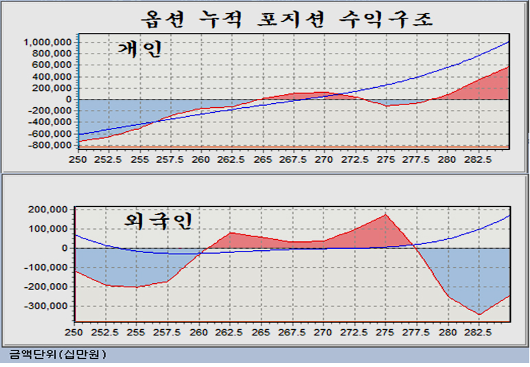 개인이 옵션시장에서 상승을 겨냥한 포지션을 늘림에 따라, 외국인은 이에 대응하는 포지션이 늘었고, 전체적으로는 262.5 ~ 275로 제한된 포지션 구도가 되어 있다. 향후 옵션 포지션 변화에 영향을 받겠으나 당분간 종합지수 자체는 이런 베팅이 강해지고 있는 옵션 시장의 영향을 받을 모습이다.