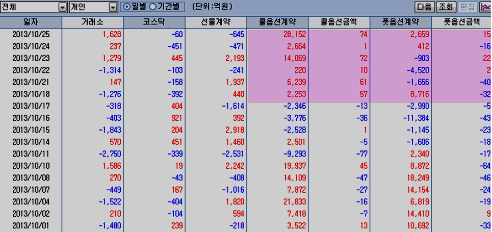 10월 18일 이후 개인의 콜옵션 매수와 풋옵션 매도 등 상승에 대한 옵션 포지션이 확대되면서 종합주가지수가 점차 투기적 겜블링 모드로 움직여, 지수를 움짐여 온 외국인이 콜옵션 매도를 늘리면서 지수의 상승을 제한한 때문이다.