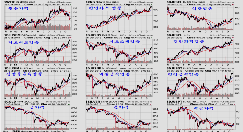 원유가격은 지난 7월 2007년 이후의 5년 상승을 제한하던 저항선 돌파와 함께, 산업재의 상승 주도와 이머징 마켓 상승 주도 국면을 이끌었으나 이후 조정을 거쳐 돌파했던 저항선까지 조정을 받고 있다.