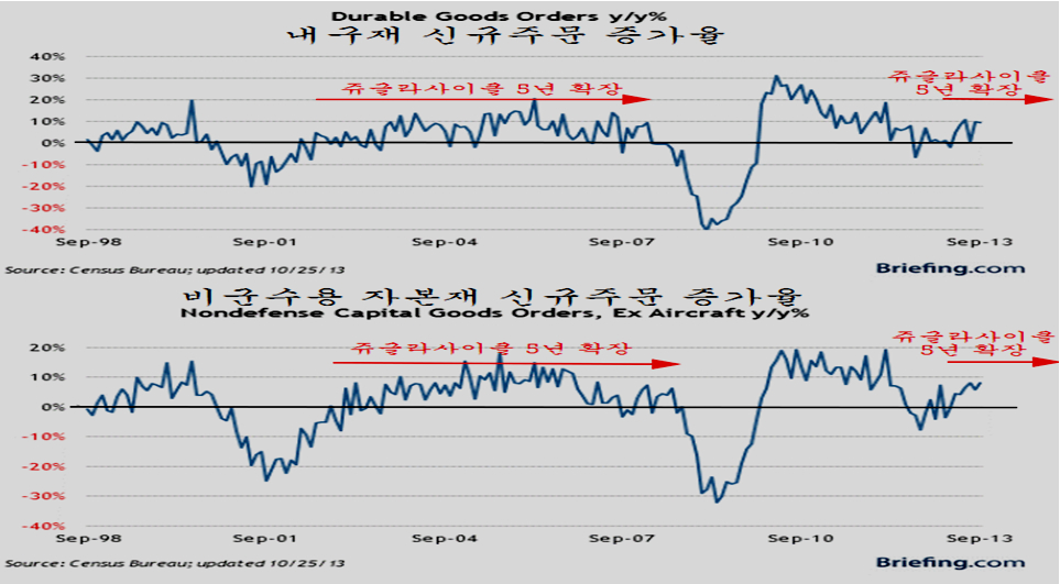 내구재 주문은 2009년 유동성 증가로 일시 호전된 후 재차 둔화과정이 이어진 후 올 하반기 들어 회복의 모습이 확연하다. 이것은 장기 경기 주기상 적어도 5년간 이어질 내구재(산업재) 기반의 경기가 회복을 시작하는 모습으로 세계 경기가 장기 회복국면으로 진입하고 있음을 나타낸다.
