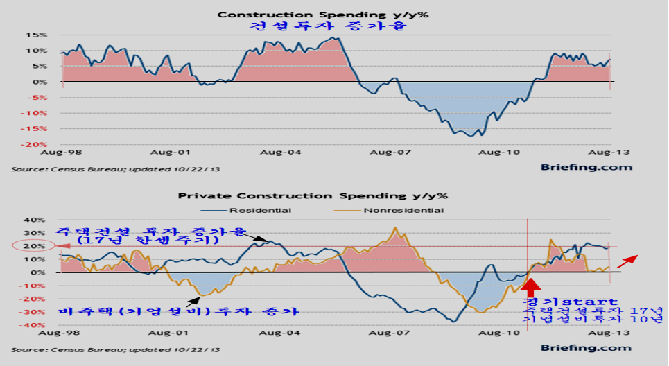 17년 주기로 움직이는 주택건설 투자가 이미 활발한 성장율에 진입한 데 이어, 10년 주기로 움직이는 기업 설비투자가 3년부터 8년까지 확장을 하는데 현재 이 모습이 시작되고 있는 모습이다.