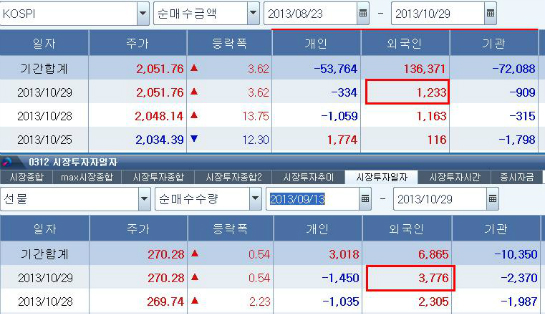중국 증시가 반락하는 시점에서 한국 증시도 약세를 나타냈으나 결국 거래소 지수는 강보합권 반등으로 마감되었다. 외국인 매수가 중단되지 않았기 때문이다. 장중 한 때 소폭 순매도를 나타냈던 현물에서 43거래일 연속 순매수라는 新기록을 이어갔고 선물에서도 3,776계약의 매수가 동반되었다.