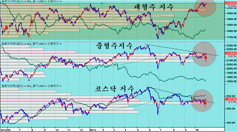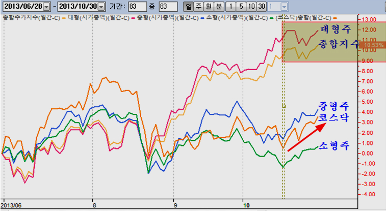그러나 세계 증시가 상승 국면에 있는 만큼, 지수를 움직이는 핵심 대형주를 제외한 일반 시장의 흐름은 상승을 보일 가능성이 높다. 시장의 흐름을 보면 10월 둘째주 까지 대형주가 오르고 중소형 및 코스닥 시장이 하락을 하는 상반된 모습을 보였지만 지난주 이후 중소형주와 코스닥이 상승 전환하여 상승세가 이어지고 있고,향후 파생상품과 관련한 지수의 정체 국면이 나타나더라도 이들 업종의 상승 추세는 계속될 듯 하다.
