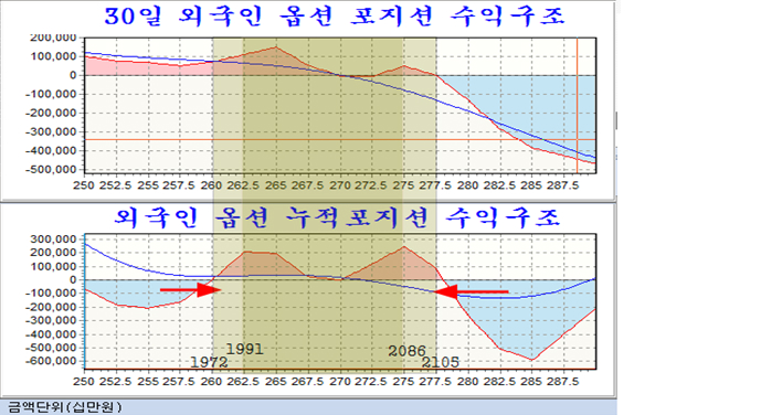 따라서 세계 증시의 움직임과 상관이 없이 우리 증시는 옵션과 관련한 게임이 전개될 가능성이 높은데, 이 게임은 외국인의 포지션을 기준할 때 좁게는 1991~ 2087, 넓게 보면 1972~2105의 변동 범위에서 11월 14일 만기까지 움직일 가능성을 준다.