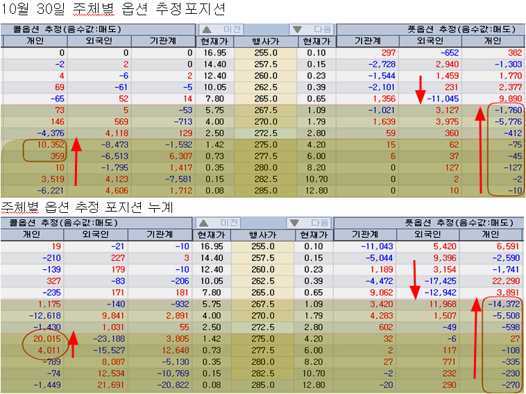 이런 지수 상승의 약세는 과열된 옵션 시장 때문인 것 같다. 개인은 오전부터 콜옵션 275를 10,000계약 이상 사들여 저항을 만들었다, 현물 주식으로 계산하면 1조 5000억에 가까운 대규모 포지션이다. 오후 지수가 반등하면서 풋옵션 매도늘 늘려 267.5 이상의 풋옵션 포지션이 8,200계약을 넘는다. 이 역시 현물 주식으로는 1조 1000억원에 해당한다. 지수가 상승을 하기에는 너무 버거운 포지션이다.